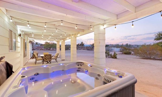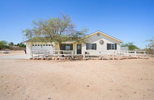 The Golden Desert Ranch is your desert home away from home. This property gives you tons of space inside and out to relax and enjoy the peace and quiet. With 3 bedrooms, 2 bathrooms, a spacious living and dining area there is plenty of room to spread out and relax with friends and enjoy the beautiful scenery and amenities of the property. The backyard gives you a true desert experience; relax in the hot tub, cook smore's over the fire pit and stargaze in the hammocks. We welcome you home!
