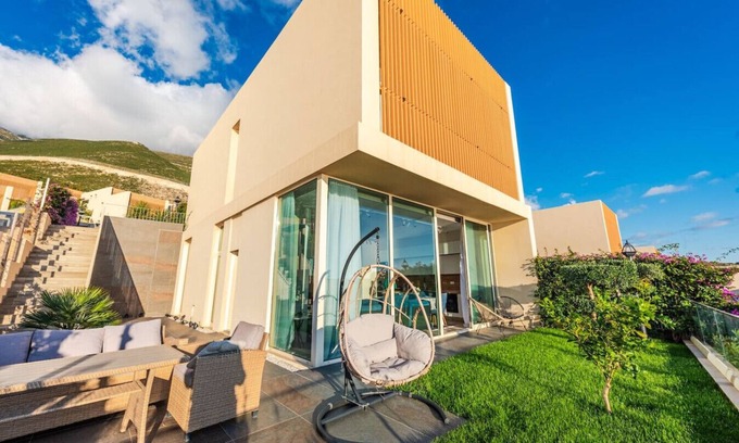 Step into this luminous villa inside the Green Coast Resort and experience breathtaking views and a stay to remember. As you walk in, the spacious open plan living room welcomes you with panoramic views of the sea. The fully-equipped kitchen offers everything you need to cook and enjoy meals with your loved ones. The master bedroom offers a king-sized bed with direct access to the garden and the second bedroom, ideal for children or friends, features 1 bunkbed which overlooks the garden area. A modern bathroom is conveniently located just down the hall, equipped with all the amenities for your comfort. For our travellers convenience outside furniture has been perfectly located to overlook the mesmerising Ionian Sea.