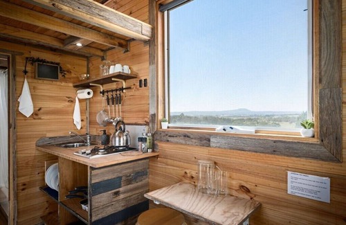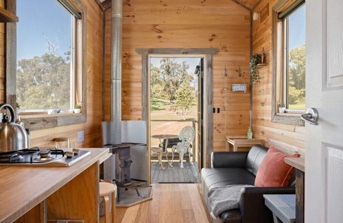 Spend your next countryside weekend getaway at Golden Plains by Tiny Away, Victoria. Where you can take in to enjoy the surrounding open fields, dense woods, and farm animals. The tiny home is close to panoramic views, city lights in the distance, walking and riding trails, and the city of Ballarat, which is only a 15-minute drive away.