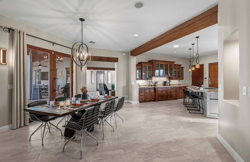 The backyard is nothing short of a desert oasis. Spend your days floating in the sparkling pool or soaking in the hot tub, then transition into evenings beneath Arizona’s star-filled sky. Gather around the fire pit for laughter and storytelling, or dine al fresco while watching the game on the outdoor TV. Multiple covered patios provide shaded retreats, while a gas grill, outdoor heaters, and ample seating make this space inviting year-round. Pool heating can be added to your reservation for $60/nt plus tax.