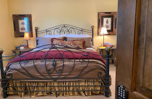 ?The Goldfinch Room is dominated by an antique iron and brass Spanish Colonial King-size bed. A desk, oversized leather chair, vintage armoire, Biedermeier side tables and 19th century oxbow sideboard complete the room. The bath has an oversized jacuzzi tub and a separate shower enclosure.