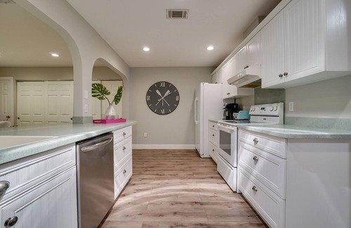 Coconut Cove offers an array of luxurious amenities designed for your comfort and enjoyment. The centerpiece of this exquisite estate is a heated, resort-style pool with a submerged tanning pad, perfect for guests to bask in the sun or unwind under the stars. Gather your loved ones around the outdoor kitchen featuring a barbeque grill, lounge in the covered lanai equipped with comfortable seating and entertainment options, or challenge friends to a game of ping pong or cornhole on the manicured lawn. Inside, the spacious living areas are adorned with brand-new furnishings and vaulted ceilings, ensuring ample space for mingling and celebration. The property can comfortably accommodate up to eight guests with three stylish bedrooms, including an opulent primary suite that serves as a tranquil escape after the festivities.
