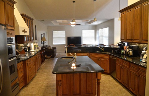 This beautiful and spacious (over 4000 sq. ft. under roof ) vacation villa was custom designed to lend itself to great entertaining areas and spacious enough for the large family too! With five bedrooms and one queen size pull out air mattress sofa beds, the house will easily be able to accommodate 12 people. There are enough bicycles for 6 people (1970's Schwinn Twin!) The 1st Master Suite has a bathroom that is out of this world ! An over-sized roman shower, a Jacuzzi tub and his and hers granite vanities help give our home the grandeur found only in world class resorts.