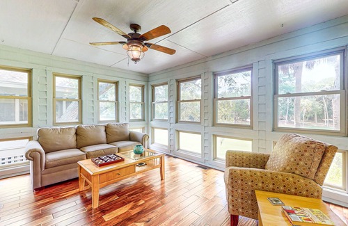 Experience the ultimate beach getaway at this relaxing villa in Edisto Beach, SC. With a private screened-in sunroom, you can relax and enjoy the coastal breeze in peace and privacy.