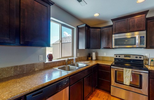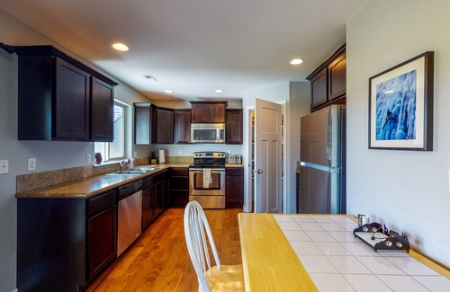 Inside, a welcoming living area features a smart TV (streaming available using your own account). The well-equipped kitchen is outfitted with a full suite of stainless steel appliances, and a large pantry provides plenty of room for vacation treats. Added perks include complimentary WiFi and a private stackable washer/dryer.