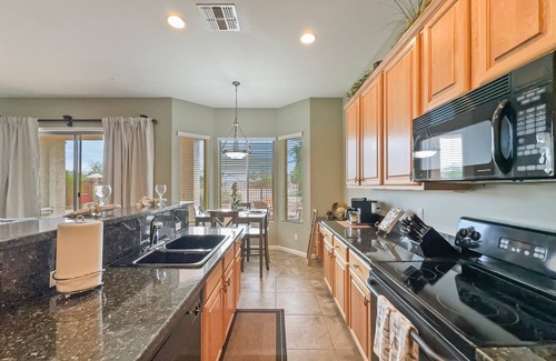 Seville Golf Course View Home is a fantastic 3 Bedroom 3 Full Bath home with lots of living space. This floor plan is perfect for the family or couples enjoying Arizona. It is split so all bedrooms have their own space. The Master is large with a king bed and television. The spa bath is attached and has a beautiful garden jacuzzi tub. It also has a walk in shower, private toilet room and massive walk in closet. Enjoy the walk out to the Hot Tub just outside as well. The 2nd bedroom has a queen bed and en suite bath with a combo tub shower. Large closet too and its own private corridor. The third bedroom has plenty of room for sleeping in the comfy full bed, but also doubles as an office for those needing to work at home or to do virtual school via Zoom. This shares the hallway full bath with tub and shower combo. Step further into the great home and the living room is perfect for lounging or meditating. Lots of seating and peaceful. The Family room is just adjacent the open concept kitchen and eat in kitchen. The kitchen is fully stocked for any gourmet snd has a pantry and service bar for family gatherings and lots of storage.
