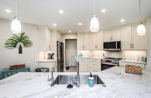 This is a beautiful 3 bedroom, 2 bath, 2100 square foot pool home in a lushly landscaped setting on the 12th hole of the Sanibel Island Golf Club.Professionally managed by Gulf Coast Vacation Rentals, Isle Awhile has been completely renovated in 2024, giving it a modern, Floridian vibe. This home has an open Kitchen/Dining/Living floor plan with vaulted ceilings and glass doors stretching across the living room, bringing in the natural light and scenic fairway views. The living room offers a wet bar with beverage fridge, cozy fireplace and a flat-screen, smart TV. Walk out to and relax on the large, screened lanai (seating and dining for 10) and listen to the "waterfall" below from your private pool and spill over spa. This home has plenty of sleeping space for you and your guests. The master bedroom has a king size bed, smart TV and opens to the screened lanai. The spacious master bathroom has a garden tub, separate walk-in shower, double vanity and huge walk-in closet. There are two guest bedrooms, one with a queen bed, the other with two twin beds; both are decorated in a comfortable island cottage look. Each guest bedroom is within steps of the guest bathroom which has a large vanity and spacious shower. There is a queen size, sleeper sofa in the Living Room. A fully equipped laundry room with full size washer and dryer is available for your convenience.