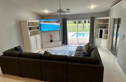Offering a garden, Golf course view & heated pool home provides accommodations in Lake Worth. This property offers a private pool, free Wifi, and free private parking. The accommodation offers a shared kitchen and a shared lounge for guests. The air-conditioned vacation home consists of 3 bedrooms, a living room, a fully equipped kitchen with a dishwasher and a coffee machine, and 2 bathrooms with an a bath or shower and a hair dryer. A flat-screen TV is offered. For added privacy, the accommodation features a private entrance. Gulfstream Mall is 6.7 miles from the vacation home, while Palm Beach Kennel Club is 10 miles from the property. Palm Beach International Airport is 8.1 miles away.