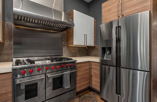 - Chef's Kitchen: The contemporary home boasts a chef's kitchen equipped with a Wolf gas range and stainless steel appliances, ideal for catering needs during your stay.