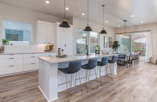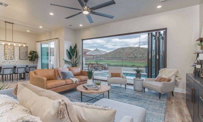 Explore nearby St. George, Sand Hollow Reservoir, and Zion National Park, then retreat to your 8-bedroom oasis, where every bedroom has a private bathroom. Two spacious living areas, a beautiful modern kitchen, and two dining spaces seamlessly blend with the backyard oasis through accordion-style doors so that days filled with world-class golf and outdoor adventures end with dining al fresco, lounging by the private heated pool, and soaking in the hot tub – all with stunning golf course views.