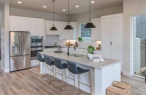As soon as you enter the main level of this immaculate home, you’ll be greeted by a completely open floor plan thoughtfully designed for large groups. Expansive accordion-style doors open fully to the backyard oasis, putting stunning golf course views on full display and seamlessly blending indoor and outdoor living. In the spacious great room, there are multiple seating options, including a sectional, full-size sofa, and accent chairs, all centered around a 70” flatscreen TV. Upstairs, a second living space boasts a 55” TV and a foosball table, the ultimate hangout spot for kids and adults alike.
