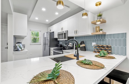 Fully Equipped Kitchen: The state-of-the-art kitchen is fully stocked with all the appliances and cookware you need to prepare anything from a quick snack to a gourmet dinner. You'll find a full-size refrigerator, oven, microwave, dishwasher, and more. A breakfast bar offers additional seating for casual meals or morning coffee.