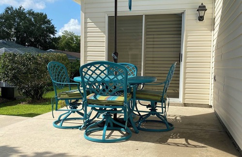 Escape to a brilliant 2-bedroom house in The Villages. Unwind in the cozy bedrooms featuring 2 queen beds and southern style blinds throughout. Refresh in the 2 bathrooms equipped with showers and hair dryers. Enjoy modern conveniences like WiFi, AC, and a washing machine. We look forward to hosting you at our place.