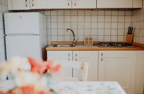 The apartment with a double bedroom, kitchen / living room with handcrafted opium sofa and orthopedic mattress, internal services in Vietri ceramic, laundry room and balcony overlooking the sea is finely furnished and with attention to the smallest details.