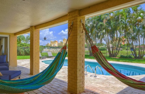 The covered patio features a comfortable seating group to enjoy your morning coffee overlooking the pool and the lake beyond. For those who seek total relaxation, take advantage of one of the two outdoor hammocks for an al fresco siesta. An outdoor dining table with an umbrella invites you to take your meals under the sun and the breeze.The sparkling pool beckons you to while away the hours in the cool water as you dream of grand adventures and the attractions of south Florida. Within just a 30-minute drive of the villa, you'll find some of the world's best shopping, international cuisine, the Fort Lauderdale airport and pristine beaches.