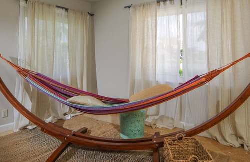Perfect for larger groups, the Weston villa has two separate living areas. The living room is ideal for talking, laughing and storytelling, with the eclectic furnishings arranged in an intimate grouping and overlooking the patio. The den offers a plush sectional sofa and an enviably comfortable hammock, with neutral decor and a few playful pops of color. A 70” HDTV with Sonos Playbar provides a home theater experience and surround sound not just for movies, but for your favorite playlist, as well.