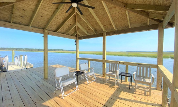Gone Away (3BR/2BA; Sleeps 10; 1K, 2Q, 2S, 1QSS) is a spacious Edisto Island home with a deep water dock located 35 miles south of Charleston, SC on beautiful and bountiful Bailey Creek. This island hide-a-way is the perfect choice for both inshore and offshore anglers as well as families looking to enjoy a short boat ride to remote sandbars and undeveloped coastal shoreline. Countless narrow creeks surround the area that are famous for red fishing and shrimping. Whether you enjoy boating, bird watching, crabbing, fishing, kayaking, or just a spectacular view of Edisto's beauty, the vantage points from the sun deck and private dock with covered pierhead are sure to wow guests of all ages. Don't forget your fishing poles and crab traps and enjoy your daily catch while taking one of the most beautiful sunsets on the East Coast. Upon entering this peaceful island retreat, you will see many traces of families that have loved this home and it's location as well as several modern updates and conveniences to ensure your group feels right at home. The roomy floor plan will allow your group to spread out, but still gather to enjoy a movie, ball game, or favorite TV show. On cooler evenings, take advantage of the wood burning fireplace as you enjoy your favorite book or refreshing cocktail. For the beach lovers in your group, this home is situated just a picturesque ten-mile drive down Highway 174, one of South Carolina's Scenic Byways, to the sandy beach where you can spend hours in the glorious southern sun. All you need is waiting for you. Take a break from the daily grind, come on down, and get on island time.