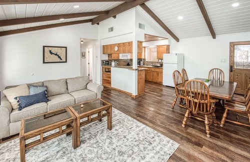 Lake View Single story cabin. Just Kick back & relax in this calm, stylish space. 3 Bedrooms, 2 bathrooms. Comfortably sleeps 8 guests. Master bedroom is very spacious with King size bed, slider to front deck, bathroom with nice sized walk in stand up shower. The second bedroom also has a king sized bed & views of the lake from the bedroom window. Third bedroom has 2 full beds. The hallway bathroom is fully remodeled with tub/shower combo and a heated towel bar.