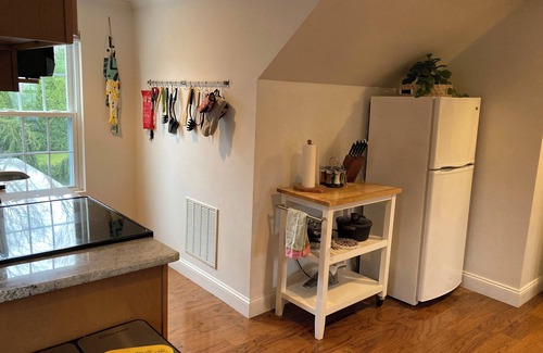 The guest house is a separate building from our main house, but right next door. Enter into the first floor, which houses a large master bedroom with high ceilings, a king-size bed and convertible futon (full-size). A pack n' play is available for infants. There are black out blinds and curtains throughout the downstairs and upstairs. There is an en-suite bathroom with a standup shower. An electric fireplace adds to the cozy ambiance. Just off of the downstairs hallway, you will notice a private porch with outdoor chairs for your enjoyment. In the summer months, we store beach equipment in the closet in the downstairs hallway for use during your stay.