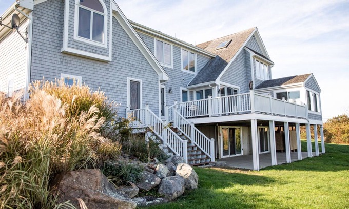 3 bedroom home with sweeping ocean views throughout! Within walking distance to Goosewing/South Shore Beach and private ocean front on the property. Reserve today to make new family memories here in Little Compton!This beautiful Beach House sits up on the hill overlooking Buzzards Bay and Vineyard Sound. The property is nine acres including a large backyard, a marsh area & pond with a boardwalk leading down to the beachfront. Sit on your own private shore front, or walk minutes down the street to South Shore/Goosewing Beach. Sit with the family on the spacious back porch overlooking the ocean. This 4,000 square foot home has three large bedrooms, three full bathrooms and two half baths. There are beautiful hardwood floors throughout and large windows that allow plenty of natural light in to the entire home. There is also a front deck, allowing you and guests to enjoy both morning and afternoon light. The living room has a gas fireplace and the three season living area overlooking the pond and ocean. Upstairs, you will find the bedrooms and office space. Watch the sunrise over the ocean from two of the bedrooms upstairs, the kitchen and the three season room. There are two stairways by which the second floor can be accessed. The kitchen has been remodeled with stainless steel appliances and granite counter tops. The breakfast table overlooks the ocean and seats 6. The dining room table seats 8. There is a finished walk out basement with a ping pong table, comfy couches and a TV. Rinse off from the beach in the outdoor shower. Sit with the family at night around the fire pit.