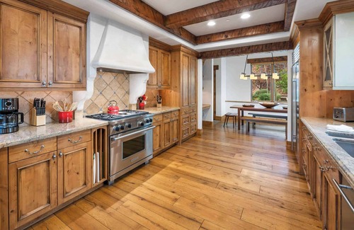 Optimally situated along Gore Creek and an easy walk from the Eagle Bahn Gondola and The Arrabelle at Vail Square, this magnificent, multi-level mountain estate offers a great room with cathedral ceilings, a stone-clad gas fireplace, a 65” Smart TV/Apple TV, and hand-hewn beams; an epicurean kitchen with premium Wolf and Sub-Zero appliances and granite slab countertops; a dining table for 10, plus a dining niche for six. Additional features include: five guest suites, each with a well-outfitted, attached bathroom (two have a king size bed and 55” TV, one has two queen beds and a 45” TV, two have two twin beds); a cozy, downstairs game room with a fireplace, 60” TV, surround sound, a pool table, and bar with a kitchenette and wine refrigerator; custom lighting and hardwood flooring; air conditioning, a laundry room, ski locker and two-car garage.