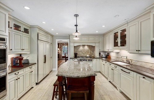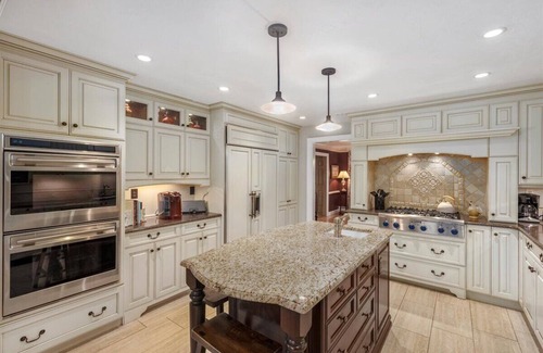 Channel your inner chef in the custom gourmet kitchen equipped with granite countertops, subzero refrigerator, and double Wolf ovens. The kitchen is stocked with essentials such as a Keurig, coffee pot, tea kettle, serving bowls, pots and pans, casserole dishes, griddle, along with spices, herbs, and cooking utensils for your convenience. Enjoy meals at the formal dining table that seats up to 12 or the large casual dining table that seats 8, perfect for gatherings with family and friends.