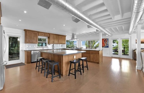 Open floor plan perfect for friends and family. Large kitchen island with space for sitting. Living area has reclining sectional perfect for relaxation. Dining table overlooking the gorgeous lake views.