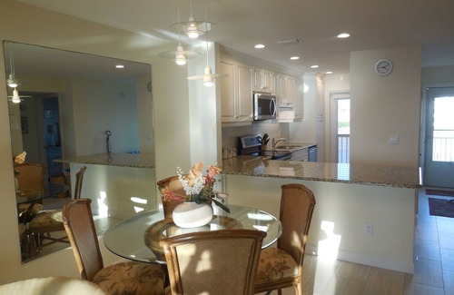 With the queen sofa bed in the living room, the unit sleeps six. Both bedrooms have a flat screen TV and new furniture including new beds. Our master bedroom has a king bed also overlooking the Gulf. The second bedroom has two twins with great views of the lagoon ‘out back’ (in front?) where you can enjoy kayaking, canoeing, fishing or just relaxing watching the fish jumping out of the water. Because the kitchen is open it allows one to see the views both front and back and it’s fully equipped with many of the comforts of home, with ample new cabinet and granite counter space for your groceries along with all new appliances to cook up a feast. Outside there are gas or charcoal grills available to make it easy to cook any freshly caught fish you may want to taste!