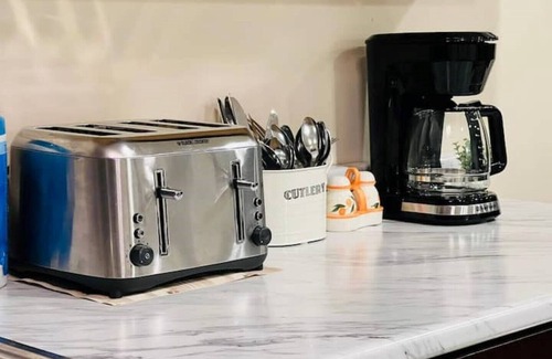 Has Free Wifi & Ethernet cable and has a Roku TV as well. Kitchen comes with basic essentials as well.