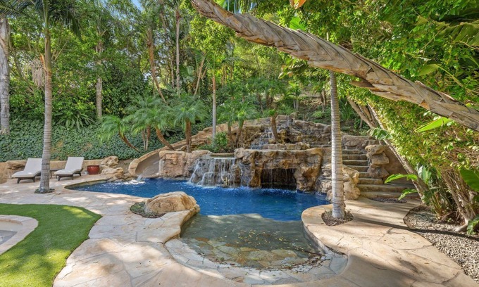 Beautiful freshly painted home with a spectacular yard, renovated rock pool, grotto, and slide and the ultimate in privacy. We are located adjacent from Calabasas and about 20 minutes from Malibu. This 5 bedroom villa can also be a 4 bedroom + office with a quiet dedicated workspace. You will feel like you are on vacation in the jungles of Costa Rica where the weather is perfect most of the year. Swim in the sparkling pool, relax in the elevated Jacuzzi under the palm trees, roast smores by the firepit or sip a glass of wine while watching the game on our 70 inch outdoor smart TV. At night, the yard is all lit up like a luxury resort. You will truly be transported to paradise. Book now and enjoy everything this luxury property has to offer.