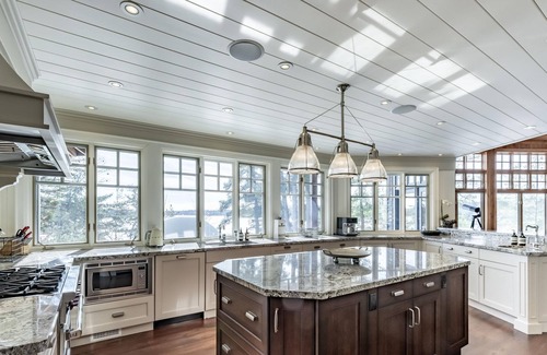 Spacious dining for 12 guests sits just off the kitchen, and walkout to the Muskoka room
