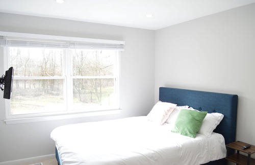 MASTER BEDROOM: (1) queen-sized platform bed with mid century modern tufted headboard, new 12" memory foam mattress, luxury linens, two bedside tables, dimmable recessed lighting, flat screen smart HDTV with over 70 cable and local channels included (or login to your Netflix), 6-drawer dresser, closet, 2 large windows with gorgeous pastoral and majestic sunset views.