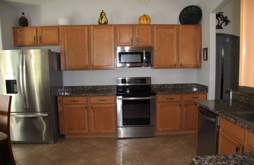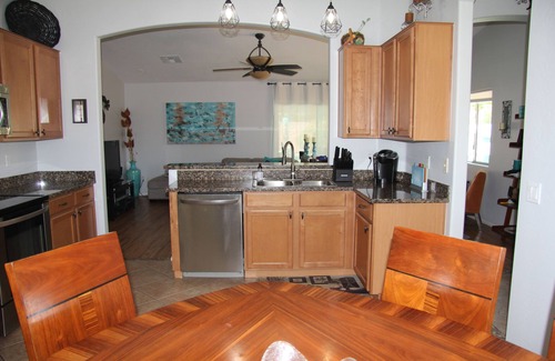 This inviting 1600 sq ft, 3 bedroom, 2 bath home is perfect for snowbirds and has great monthly rates. Free WIFI throughout property and satellite TV. The spacious master bedroom has a king size bed and ensuite bathroom. It also includes a direct walk out to the backyard which has a gorgeous custom designed heated pool and 5 fruit trees! Both guest rooms both have a queen bed and a warm decor. There are three flat screen TV's in the house, as well as a sound system in the living room and outside. Kitchen is fully updated and has everything you could need including: coffee pot, blender, pots, pans, dishes and utensils. The covered lanai is a great place to eat dinner, or you can choose to eat in the kitchen the modern dining table with seating for 6. The pool is heated (upon request $)and has a shallow end for children. Pool comes with an umbrella and in pool seating for those blazing hot Arizona days. The home also has a wood burning firepit outside, pool toys and floaties. NO LIFE JACKETS on premises. You have to see this house to believe how beautifully decorated it is and is the perfect spot for your next family vacation! Only 5 mins from the new and exciting shopping district of Prasada! Every amenity you could ever want and more is located within a 5 min drive including - Costco, restaurants, shopping and soon a casino!