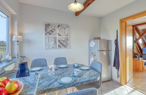 This light-flooded holiday apartment on the first floor offers you an inviting and open design with attractive wooden furniture. Large windows let in plenty of natural light and create a pleasant living atmosphere. Relax on the sofa after your excursions and enjoy the ambience with exposed half-timbering. You can cook together in the well-equipped kitchen and then enjoy your meals on the terrace. The garden with barbecue invites you to spend relaxing hours outdoors, perfect for cosy summer evenings in idyllic surroundings.