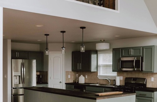 The kitchen is one of our favorite spots in the house. With totally stocked cabinets painted a dreamy forest green to complement the lake and woods hues through the windows and new, full-size stainless-steel appliances, you’re equipped to prepare a holiday meal, celebrate an occasion, or host hors d'oeuvres - but we promise to also send over our recommended restaurant list if cooking on vacation is not your cup of tea! Speaking of that, we also stock a kettle and variety of organic teas (usually a black tea and herbal tea option at minimum) and coffees (usually something flavored, something standard, and something decaf at minimum) for the Keurig - which includes a fun iced option for our summer guests. For specifics on what we’re providing in the kitchen, please check out the reference section below or feel free to reach out - we’re always growing the list of items we provide!