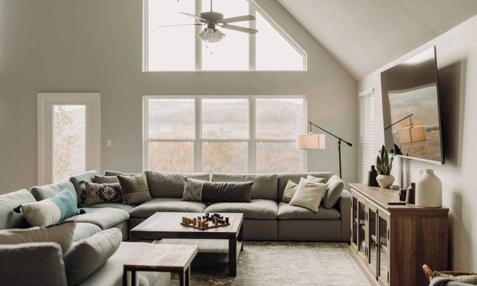 When you enter the home using the easy Nest smart lock, you’ll open the door into the main living room with two-story windows covering the entire southwest wall overlooking the water below and valley across. In the living area, the massive sectional sofa is perfect for large groups of 10-12 or more, long naps, or a relaxing movie night with the 75” smart TV, always logged into several various streaming platforms. The sofa has a floating ottoman so you can create an especially deep corner in the sofa, comparable to a full-size bed for a cozy morning coffee spot or even extra overnight guests.