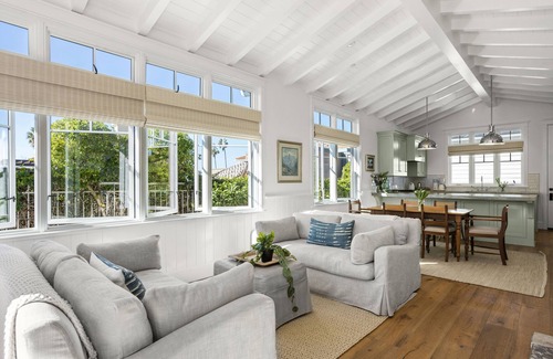 This luxurious beachside residence boasts soaring ceilings and large windows for gazing at the picturesque Del Mar waterscape and lush landscape. The abundance of natural light cascading into the Cottage further outlines its many fine details and airy layout.