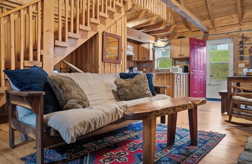 • Note: The futon pictured in the living room has been replaced with a couch. Also, there are approximately 15 steps from parking location to cabin. 2 dog limit.