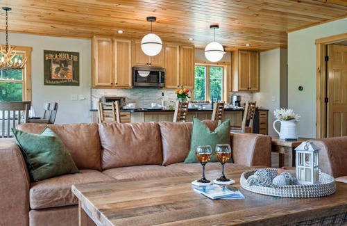 Step into the heart of Songo Chalet, where floor-to-ceiling windows bring the beauty of the mountains indoors. The open-concept design makes it easy to gather with family and friends, whether you're sharing a meal or cozying up by the fire.