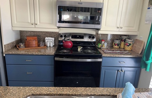 The first floor has an open floor plan with a kitchen, living and dining area and a half bathroom. The kitchen is equipped with a water purification hooked to the ice maker and sink side dispenser; dinnerware, flatware, pans and utensils included. Appliances include a microwave, coffee pot, refrigerator, dish washer and electric range. A stackable washer and dryer are tucked away in the hall. The television in the living area has basic cable and Wi-Fi for streaming. Fully furnished with manual reclining loveseat and recliner downstairs. Downstairs half bathroom has toilet and sink.