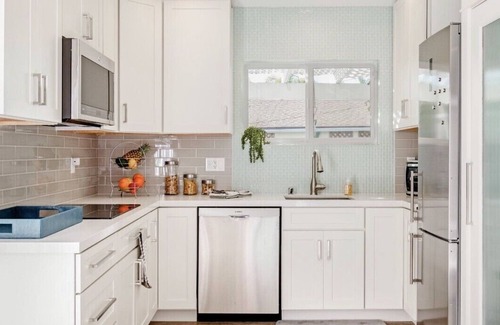 The guesthouse sits back away from the street and inside the privacy of our gated backyard. We have 2 separate seating areas in the backyard. Our large table under the pergola is a lovely place to dine! The gorgeous new kitchen features an induction cooktop, refrigerator with ice maker, silent dishwasher and plenty of surface area with our gorgeous quartz countertops! There is plenty of storage with a pantry, closet and dresser. Cozy up in the super comfy brand new oversized recliner and watch movies on our large 55” flatscreen TV! We have free Netflix, Hulu, Amazon Prime, HBO and over 300 free movies! Local channels available also for news and sports!
