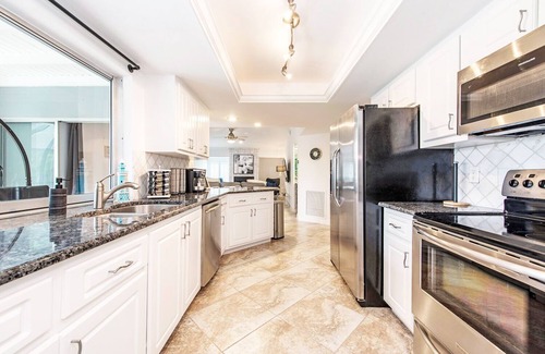 A beautiful kitchen, dining and family room await you with glass sliding doors that open to the covered lanai and screened in spa & pool area. The kitchen is fully equipped with granite counters and ample cabinets for your grocery items. The square table in the dining area seats six plus there is seating for four at the breakfast table and two at the breakfast bar. The family room is comfortably appointed with two over stuffed couches, 65" flat screen smart TV with free Hulu with live tv and plenty of seating. WiFI is provided throughout the home. Each of the two bedrooms have their own televisions.