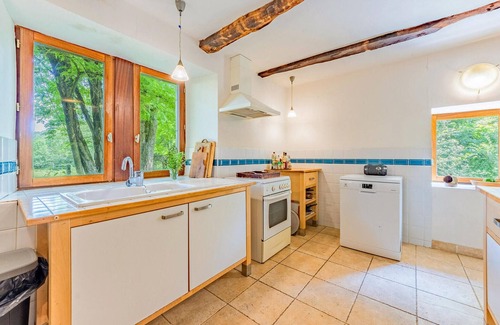 Experience a dream holiday in this charming, lovingly renovated farmhouse in Caylus. The combination of original charm with exposed stone walls and wooden beams as well as modern furniture and stylish lighting creates a unique atmosphere. The spacious kitchen, equipped with modern amenities, invites you to prepare regional delicacies. Linger in the cosy living room with its inviting sofas and end the day with a book or a glass of wine.
