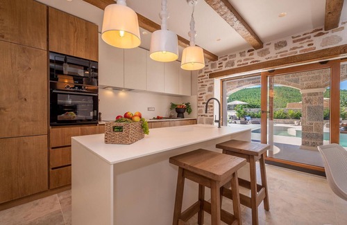 Welcome to this modern stone house in traditional architectural style that invites you to an unforgettable vacation. On two floors, you can enjoy the luxury and privacy of the bedrooms with en-suite bathrooms and experience the charm of the wooden furnishings. On the first floor, the open-plan living room becomes the meeting point for the group, where you can cook together. From here you can step out onto the covered terrace and eat. Afterwards, you can sunbathe or swim by the pool. If you want more peace and quiet, the two large balconies offer great relaxation areas to read a book or listen to your favorite podcast.
