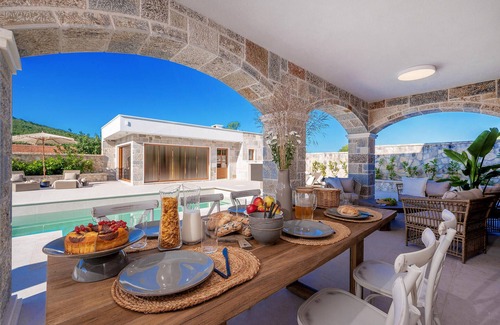 - Seafront villa with heated swimming pool, teak deck, open sea view, boat mooring