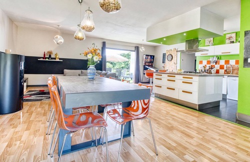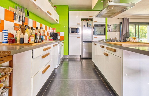 Spend your next holiday in France in this stylish holiday home near Coursac. Look forward to spending time with your family in the spacious living area. The modern furnishings with light wooden floors, an open-plan kitchen and a cosy sofa area create a pleasant atmosphere. The colourful accents also contribute to the carefree mood. Take your meals at the beautiful dining table and enjoy socialising. End the evening relaxing in front of the wood-burning stove or watching a film on the large-screen TV.