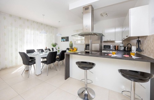The modernly designed vacation home with pool is spread over three floors. Next to the spacious lawn there is an outdoor grill where you can prepare delicious food while your children enjoy the game. On the first floor are fitness and sauna. The house is located in a green residential area and walking distance from the coast. The beautiful pebble beach is also only 190 m from the house. The historic town of Trogir, a UNESCO World Heritage Site, is 8 km away and offers plenty of entertainment for all generations.