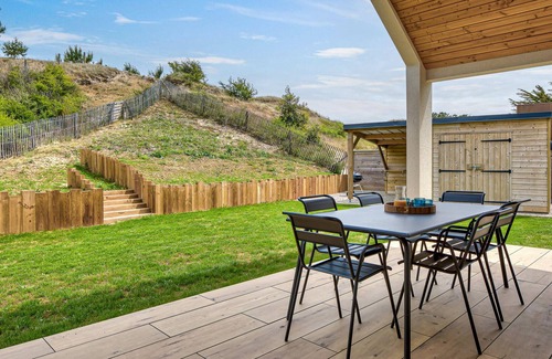 Welcome to this modern holiday home, nestled in an idyllic dune landscape and just a stroll from the beaches of the Manche, which invites you to spend relaxing days with your loved ones. Enjoy the tasteful furnishings of the bright interior with harmonious meals at the stylish dining table and cosy games evenings on the comfortable sofa.