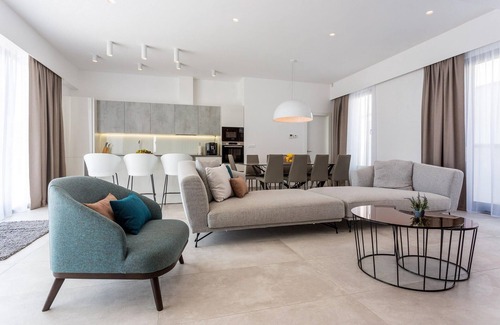 The modern Villa Alba Seget offers you light-flooded rooms, a high-quality kitchen and a stylishly furnished living room with a view of the glittering sea. The tasteful furnishings, coupled with state-of-the-art equipment, ensure an all-round successful holiday experience. Discover the high-quality furnished rooms in bright colours on two floors. All bedrooms have their own bathrooms so that you can enjoy a good night's sleep and privacy. In contrast, the villa offers you entertainment and activity with PlayStation and a first-class fitness area.