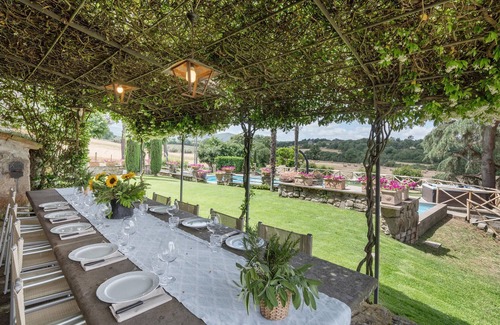 Your vacation home is situated on a hill surrounded by lawns, an orchard and olive grove. Its garden is completely fenced and the beautiful pool has a separate children's pool (4x4 m, max depth 1.20 m). On request you can visit an Etruscan burial site. In the house you will find a living room with piano, a library with access to the garden, a dining room with access to the garden (arbor with stone table and thatched roof); arbor with large table and barbecue at the back of the house, ideal for outdoor dining. On the second floor, a suite consists of two interconnecting rooms, one with a double bed, the second with a triple.